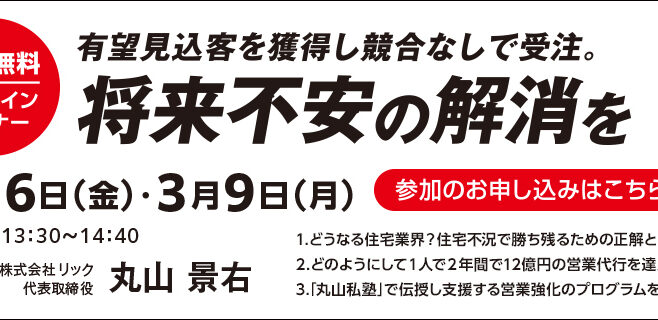 2026年1月30日 / 最終更新日時 : 2026年1月30日 株式会社リック 丸山私塾・参加無料 オンラインセミナー開催のお知らせ 丸山私塾・参加無料オンラインセミナー 有望見込客を獲得し競合なしで受注。「将来不安の解消を」を開催いたします。 講 師:丸山 景右 開催日:2026年 3月6日(金)・9日(月) 時 間:両日とも13:30〜14:40 ・・・[続きを読む]
